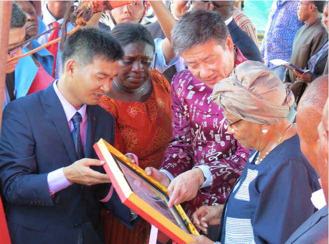 儀式最后,援利比里亞政府項(xiàng)目組代表高元明向利比里亞總統(tǒng)贈送禮物,祝福中利友誼長存。
